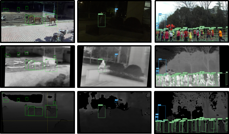 基于以上背景与需求,本赛题旨在推动复杂城市场景下准确鲁棒的多模态目标检测算法发展,鼓励参赛者通过可见光、热红外与深度多源异构数据融合和检测理论方法的创新改进,有效突破单一模态感知在夜间、逆光及遮挡等极端环境下的局限性,提升算法的泛化性能。本赛题的研究成果不仅有助于促进多模态数据融合理论的深化,更可直接应用于全天候交通监控、恶劣天气自动驾驶导航、城市安防巡检及应急救援探测等关键领域,对改善社会公共安全、提升城市智能化管理水平具有重要的学术价值与现实应用意义。本赛题将提供包含可见光RGB图像、红外Infrared图像和深度Depth图像和的目标检测数据集。参赛队伍需要设计基于三模态数据输入的视觉目标检测算法,充分利用多源异构数据互补信息,实现复杂场景下精确的目标检测。